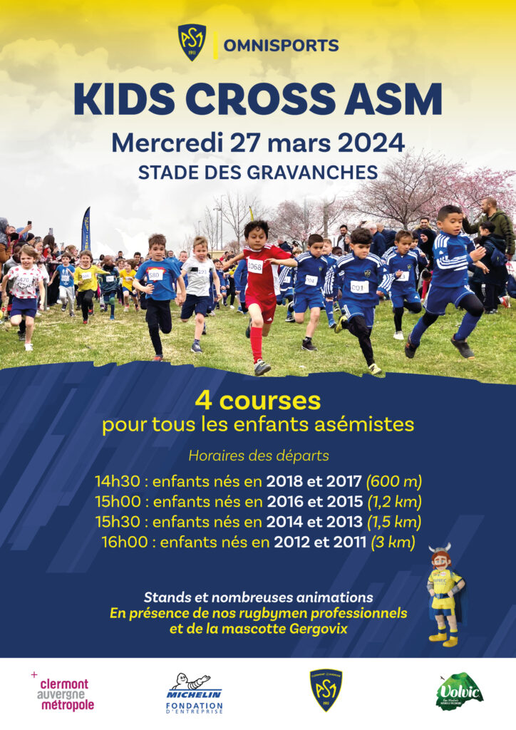 L’ASM Omnisports organise le Kids Cross ASM 2024, le mercredi 27 mars à partir de 14h au stade des Gravanches, rue du Pré Comtal – 63100 Clermont-Ferrand.
