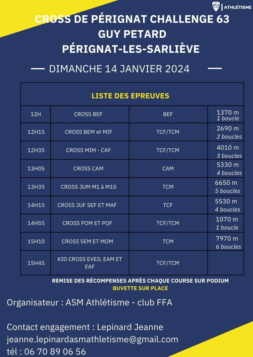 Organisé par la section athlétisme de l’ASM Omnisports, le cross comporte 8 épreuves sur une boucle unique à parcourir 1 à 6 fois selon la catégorie d’âge. Le premier départ est prévu à 12H pour les benjamines et le cross sera clôturé par une épreuve spéciale Kids cross éveil à 15h45.