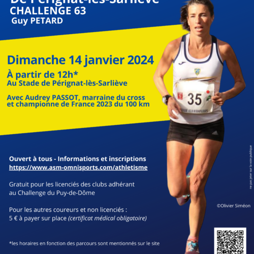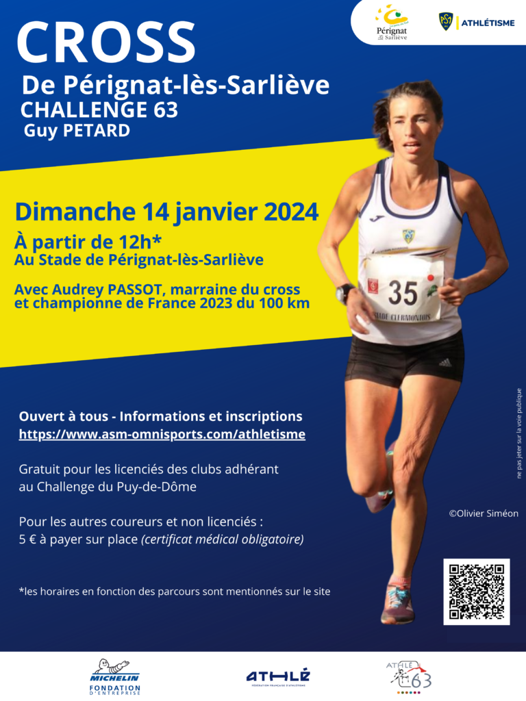 Le cross de Pérignat-lès-Sarliève, 6ème des 8 cross du challenge du Puy-de-Dôme, aura lieu le 14 janvier prochain au stade de Pérignat-lès-Sarliève. Audrey Passot, notre asémiste championne de France du 100 km en 2023, sera la marraine de cette édition.