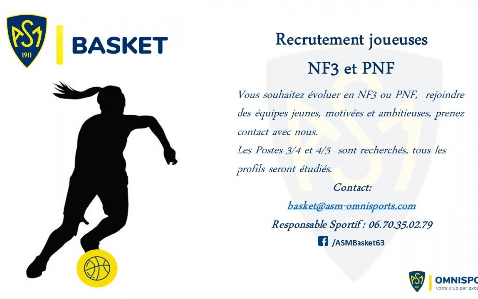 ASM Basket : Recrutement joueuses NF3 – PNF