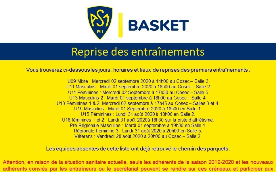 Vous trouverez ci-dessous les jours, horaires et lieux de reprises des premiersentraînements : U09 Mixte : Mercredi 02 septembre 2020 à 14h00 au Cosec [...]
