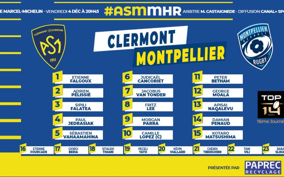G. BERIA entrera en cours de jeu, au poste de pilier. Sa mobilité et sa puissance permettront d’user encore plus le pack du MHR. C. TIBERGHIEN continuera à glaner du temps de jeu en étant remplaçant à l’arrière, tandis que K. VIALLARD et T. VILI continuent leur apprentissage du très haut niveau en étant tous les 2 remplaçants (respectivement à la mêlée et en 3/4 centre).