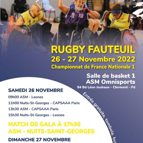 Les 26 et 27 novembre 2022, l’ASM Omnisports recevra sur le site de la Gauthière la première manche du championnat de France de Nationale 1 de rugby fauteuil.