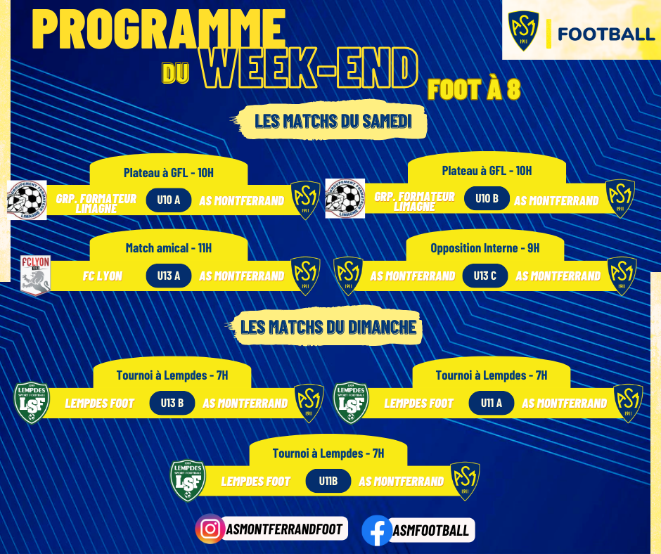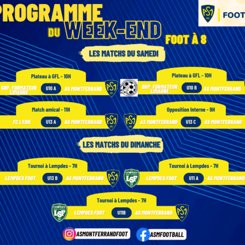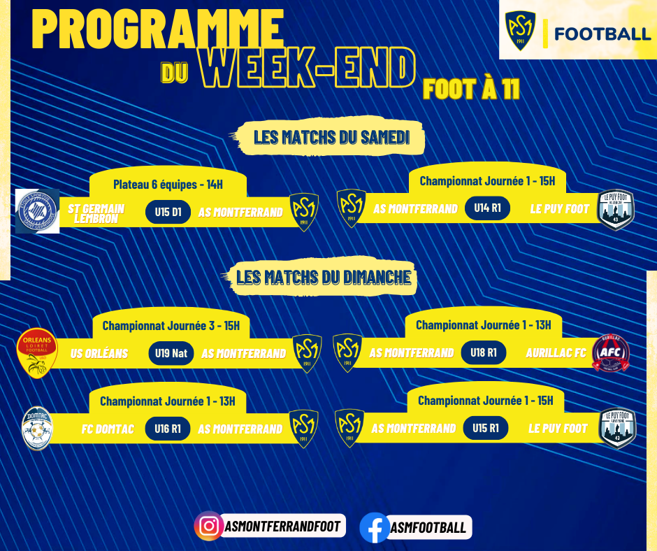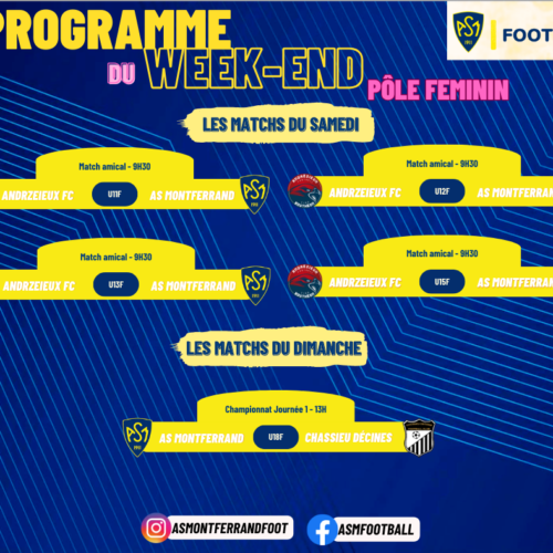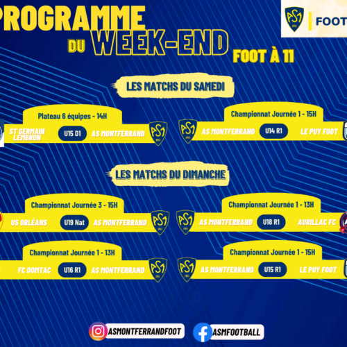 Nos U14R1 et U15R1 reçoivent Le Puy Foot exceptionnellement sur des jours différents samedi et dimanche à 15H aux Gravanches. Nos U16R1 quant à eux commenceront par un déplacement périlleux à La Tour de Salvagny pour y affronter le FC Domtac. Nos U18R1 recevront eux le FC Aurillac pour entamer leur championnat dans le même temps que nos U18F qui accueilleront Chassieu Décines.