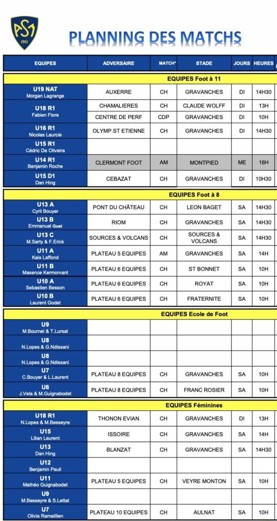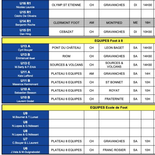 Découvrez l’agenda de ce week-end mouvementé qui arrive, notamment aux Gravanches. Samedi, rendez-vous dès 14h pour assister aux matchs de : nos U13F et U15F contre Blanzat et Issoire. Dans le même temps, les U13B joueront contre le FC Riom aux Gravanches. Les joueurs de Manu Guet tenteront de se relancer après leur courte défaite contre Chamalières la semaine dernière. Les U11A joueront aussi un plateau d’exception à 14h avec la réception de deux équipes suisses sur le terrain 1.