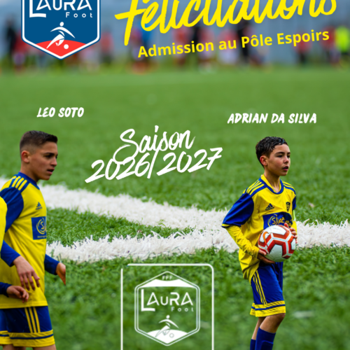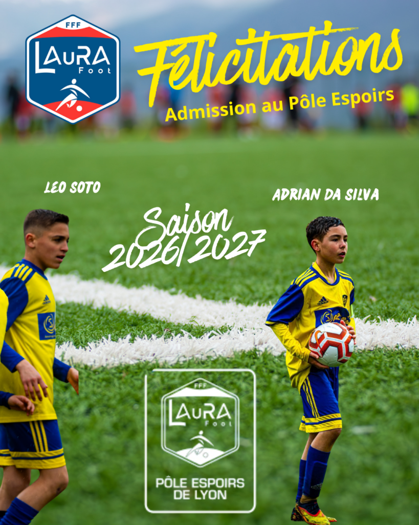 L’AS Montferrand Football est fier d’annoncer l’admission de deux de ses joueurs au Pôle Espoirs Mixte de Lyon pour la saison 2026/2027. Il s’agit de : Adrian Da Silva Léo Soto Cette sélection constitue une reconnaissance du travail, de l’investissement et de la progression de ces jeunes joueurs au sein du club. Le club tient à féliciter Adrian et Léo pour cette belle réussite, et leur souhaite pleine réussite dans cette nouvelle étape de leur parcours sportif. L’ASM Foot félicite également l’ensemble des éducateurs pour leur engagement dans la formation et l’accompagnement des jeunes talents.