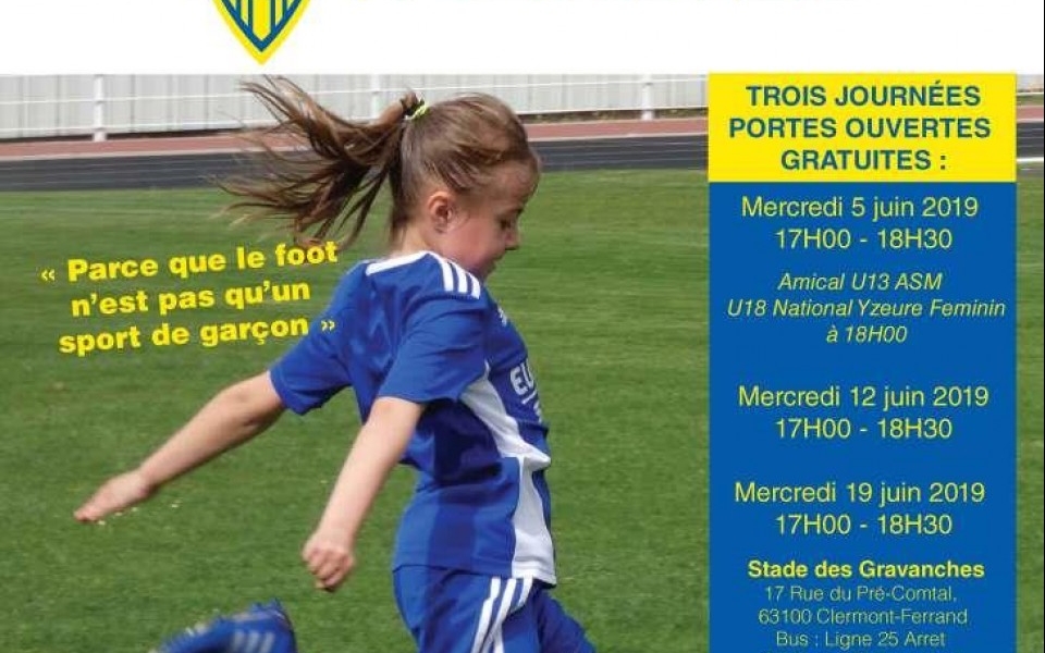 Ces trois journées « 100% féminin » permettront aux jeunes de découvrir le football à travers différents jeux, ateliers et matchs qui se dérouleront les mercredis 5 juin, 12 juin et 19 juin – de 17H00 à 18H30 – au stade des Gravanches, rue du Pré-Comtal à Clermont-Ferrand.