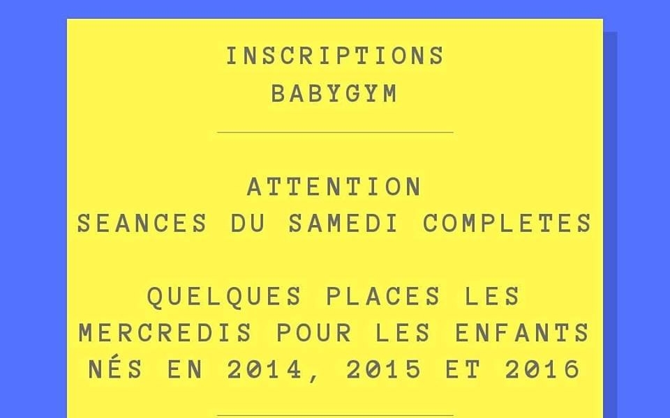 Les 2 séances de Baby gym du samedi matin sont complètes. Les personnes intéressées peuvent venir inscrire leur enfant sur liste d’attente.
