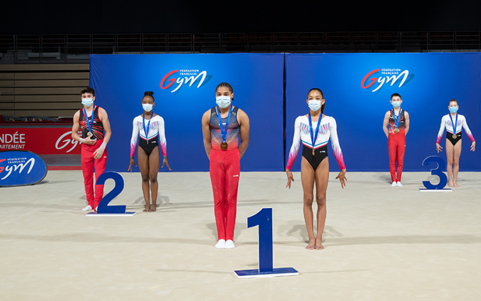 Au Vendéspace à Mouilleron-le-Captif, salle que les gymnastes et teamgymnastes du club connaissent bien, notre jeune gymnaste était accompagnée sur le podium par Lilou VIALLAT (1ère et Championne de France) et Ming GHERARDI VAN EIJKEN (3ème), toutes les deux coéquipières de Nayana au Pôle de St Etienne.