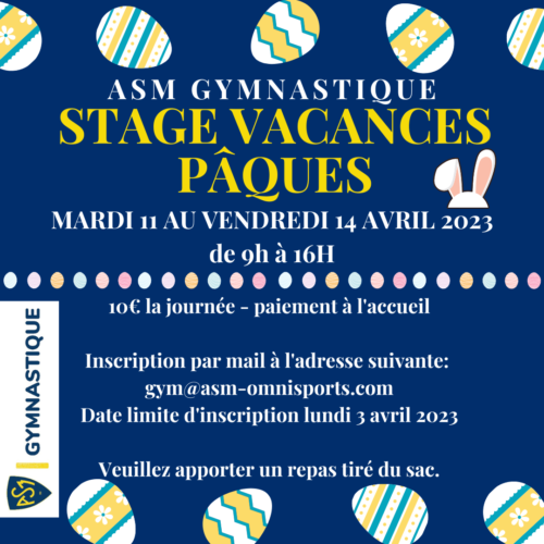 Un stage destiné aux gymnastes du club (à partir de 2016) est proposé lors des vacances de Pâques 2023. Au programme: multi activités (gymnastique, teamgym, gymnastique acrobatique, trampoline, et activité manuelle).