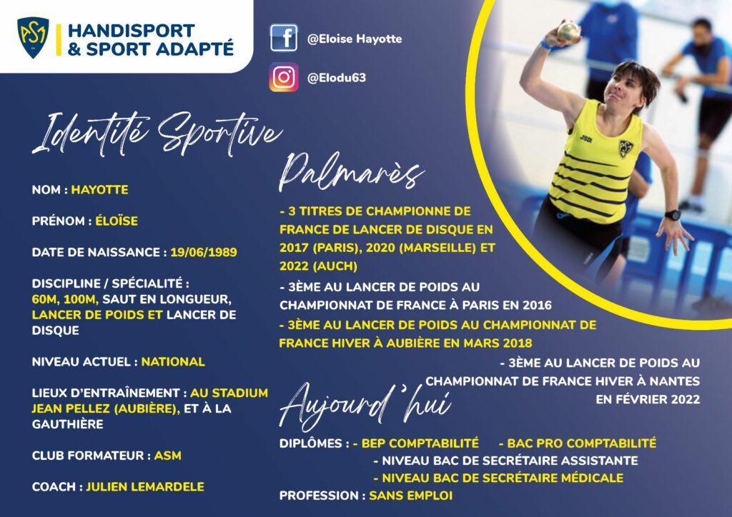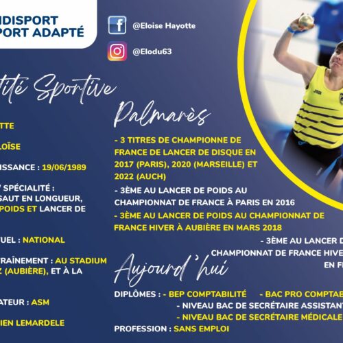 Eloïse Hayotte, pratique l’athlétisme au sein de notre section où elle concours au lancer de poids, au lancer de disque, en saut en longueur et en course sur 60 m et 100 m. Eloïse est donc une athlète complète aux multiples titres et records personnels ! (retrouvez son palmarès en bas de cet article).