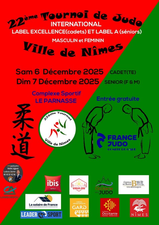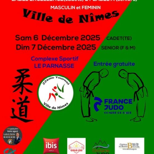 Ce dimanche 7 décembre 2025, le 22ᵉ Tournoi Séniors Label A Excellence de Nîmes (30) a rassemblé près de 300 combattants venus de toute la France pour une journée de judo de haut niveau.