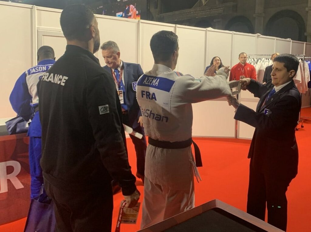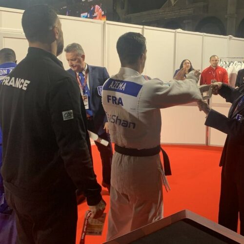 Kévin Azéma, notre professeur de 🥋 💛💙, était sélectionné pour participer à ce tournoi suite à son titre de champion de France 1ère division (voir l’actu 👉 https://www.asm-omnisports.com/judo/actualites/kevin-azema-champioooooooooon-de-france-2023/ ). Kévin a combattu en moins de 66Kg. 😢 Malheureusement, il se blesse au pouce dès son 1er combat. Il n’abandonne pas, il sert les dents mais cette blessure l’empêche de saisir le judogi de son adversaire. Il va au bout de cette rencontre, seulement sans sa main gauche, Kévin ne peut pas s’exprimer comme il le souhaite. Il perd logiquement le combat contre le futur 3ème de la catégorie 💪👏 La section judo remercie les asémistes qui sont venus encourager Kévin à AccorArena de Bercy 👌