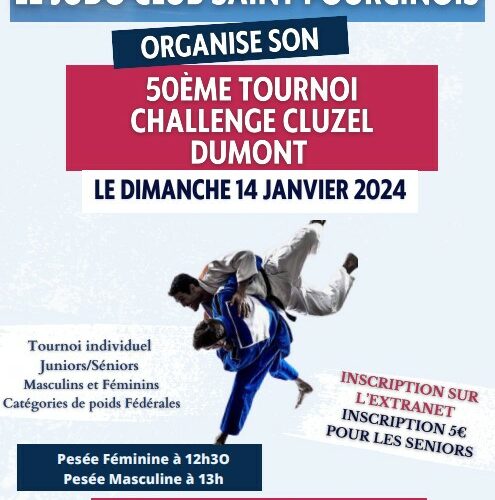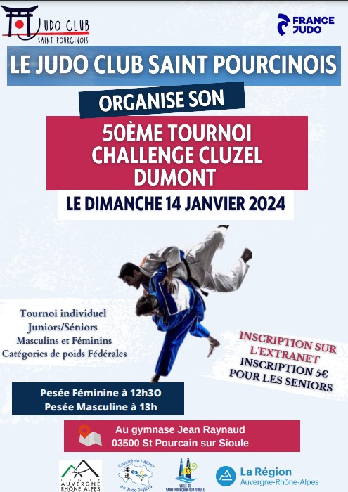 Le dimanche 14 janvier 2024 avait lieu un circuit régional minimes suivi du 50ème challenge Cluzel Dumont (individuels juniors-séniors) à Saint-Pourçain-sur-Sioule (03). Ces deux évènements étaient organisés par le Judo Club Saint Pourcinois.