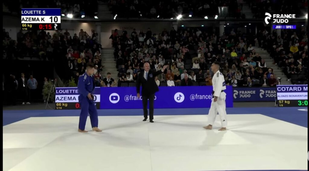 Quel Combat ! 😍 Après deux minutes de grosses batailles de garde et d’affrontement physique, Kévin lance un magnifique Kata guruma (roue autour des épaules) d’anthologie, l’arbitre annonce Ippon ! C’est la délivrance.