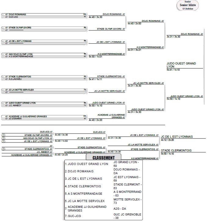 « Notre Ă©quipe mixte đĄđ” se hisse jusquâen demi-finale aprĂšs avoir gagnĂ© face au Dojo Olympique Lyonnais (5V/1V) et JC de lâEst Lyonnais (4V/3V). Nous perdons de justesse en demi-finale contre le Dojo Romanais : Ă©galitĂ© de victoires 3 Ă 3, mais ils nous passent devant pour un petit point. Nous affrontons le stade Clermontois pour la place de 3Ăšme. Malheureusement, nous nâarrivons pas Ă nous remobiliser, nous perdons 5V Ă 1V.