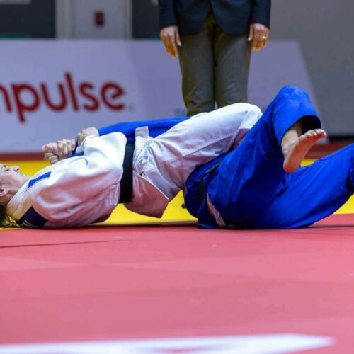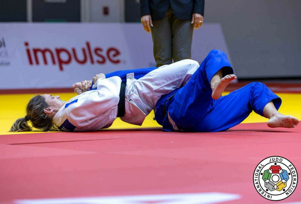 Maëlle est face à une Italienne. Elle est très déterminée, concentrée et appliquée. Lors d’un passage au sol, Maëlle arrive à déplier le bras de son adversaire, l’Italienne résiste fort, Maëlle se repositionne rapidement et parfaitement pour ponter et mettre une tension maximale dans le bras de son adversaire. L’Italienne tape, elle abandonne.. c’est la délivrance !