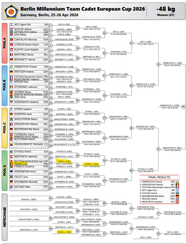 De son côté, Line n’a pas démérité pour sa première sortie internationale. Elle débute très fort en remportant ses deux premiers combats contre une Espagnole et une Portugaise 💪. Malgré une défaite face à une Azérie, puis en repêchage contre une Autrichienne, Line repart avec une expérience riche et prometteuse pour la suite 👍