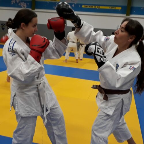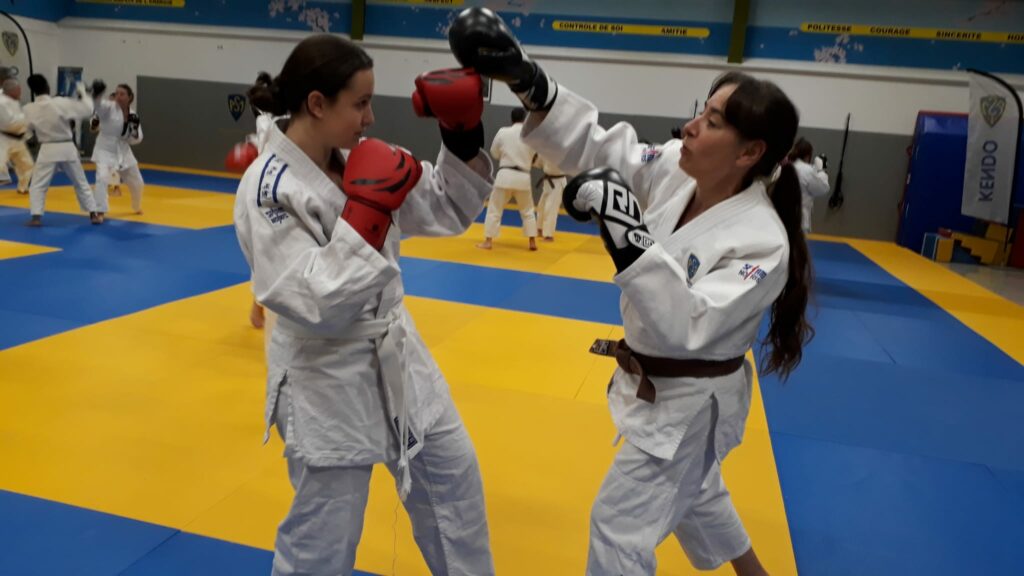 - Une première partie poings et pieds: Cette partie s’apparente beaucoup au combat de Karaté Shotokan, le but étant de porter des coups contrôlés à l’adversaire à l’aide de ses poings et de ses pieds.