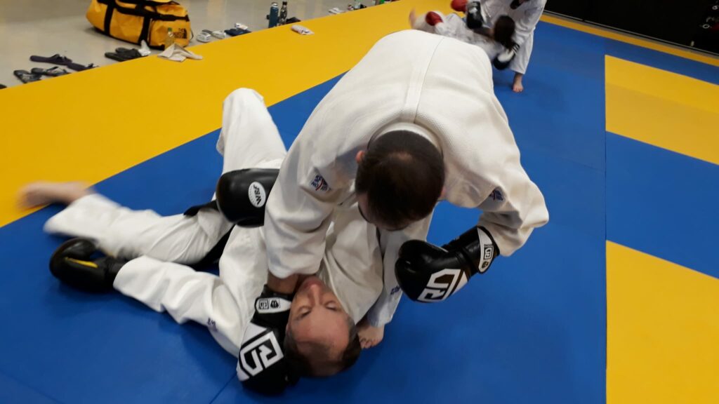 - Une troisième partie sol : Cette partie est proche du combat au sol du Jujitsu Brésilien. On doit ici contrôler l’adversaire sur le ventre, sur le dos ou le faire abandonner avec une prise de soumission (clef ou étranglement).