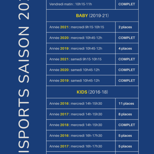 - Baby (nés en 2019) : Sur le créneau du mercredi matin, de 10h45 à 12h, il reste encore 4 places disponibles.