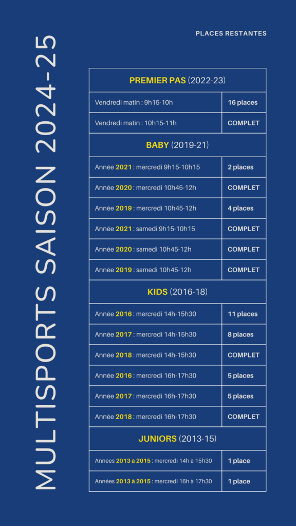 Les premières séances des Baby (2019-2021), des Kids (2016-2018) et des Juniors (2013-2015) ont eu lieu aujourd’hui, et nous sommes heureux de voir tant d’enthousiasme chez nos jeunes sportifs. Grâce à votre engagement, la plupart des créneaux sont déjà complets, en particulier chez les plus petits. Voici un récapitulatif des places restantes pour cette nouvelle saison :