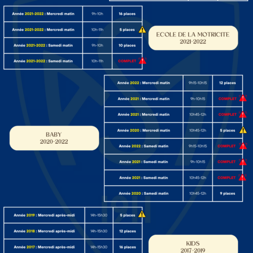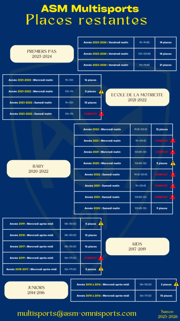 Les créneaux se remplissent vite, et il reste encore quelques places. Si vous souhaitez que votre enfant participe à une expérience sportive complète et variée tout au long de la saison, n’attendez plus pour finaliser son inscription.