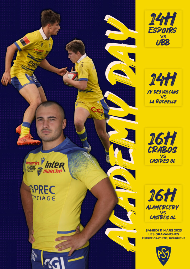 Ce samedi 11 mars aura lieu l’Academy Day 2023 de la section rugby de l’ASM. L’occasion de voir toutes les équipes de jeunes disputer des rencontres de très haut niveau aux Gravanches, toutes décisives dans l’optique des phases finales. Tout au long de la semaine, nous vous proposons un focus sur une rencontre de ce samedi, jusqu’au jour J de l’évènement.