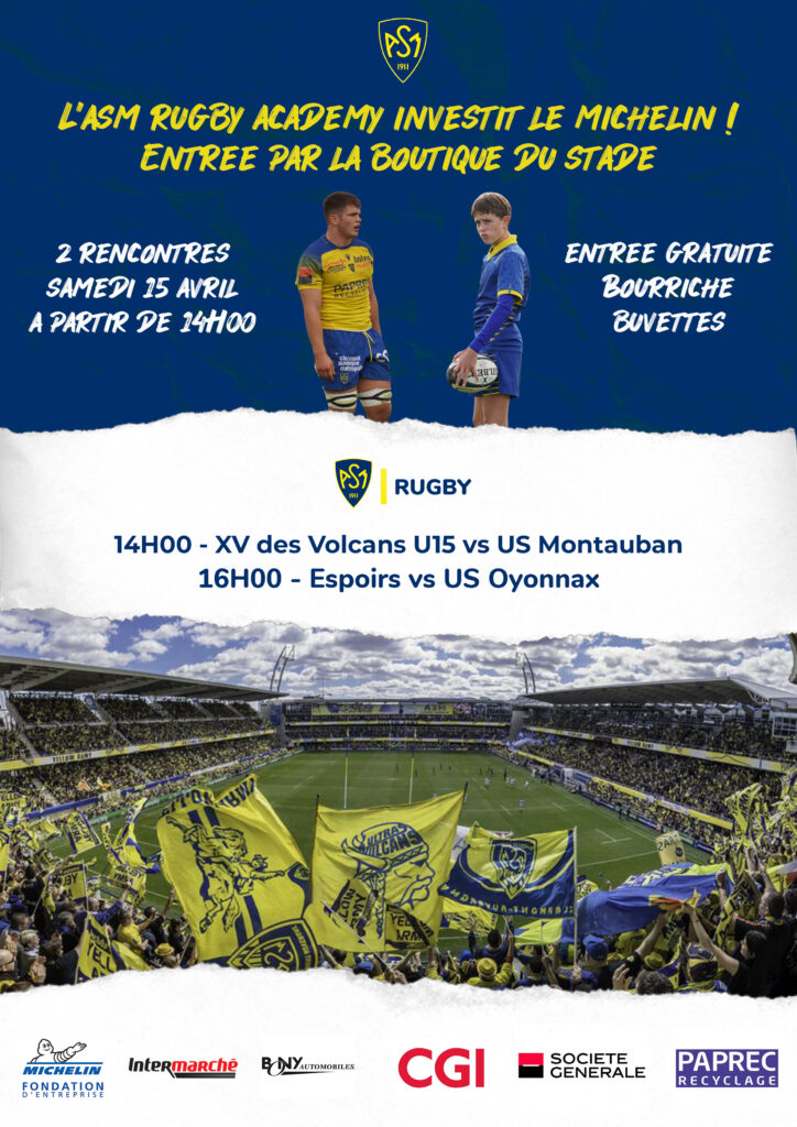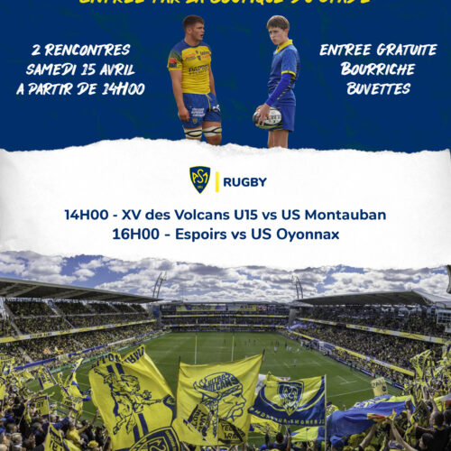 Ce samedi 15 avril verra l’ASM Rugby Academy investir le stade Marcel Michelin, à l’occasion de deux rencontres décisives pour la fin de saison des équipes concernées. Le premier coup d’envoi sera donné à 14H00 pour notre équipe U15, puis à 16H00 pour nos Espoirs.