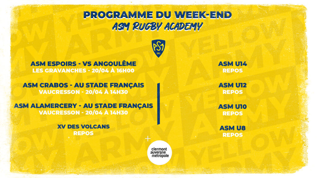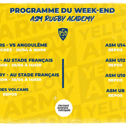 Les Espoirs doivent confirmer à domicile, un déplacement à Paris pour les groupes Crabos et Alamercery, et l’école de rugby au repos… Retrouvez le programme du week-end de la formation montferrandaise.