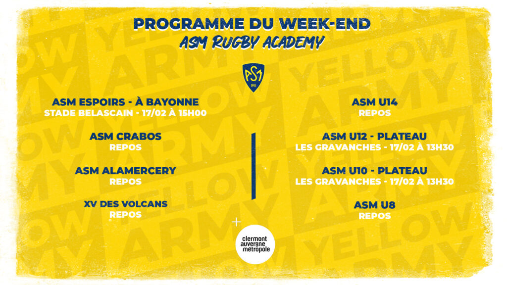 - L’ASM reçoit Brive, Aurillax, et Lyon – Samedi 17 février à partir de 13H30 (Les Gravanches)