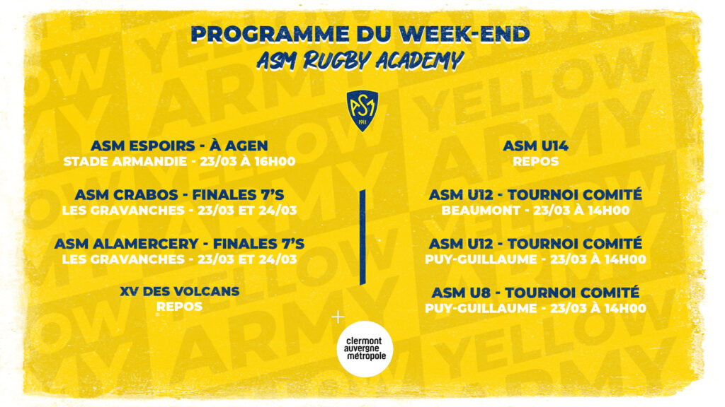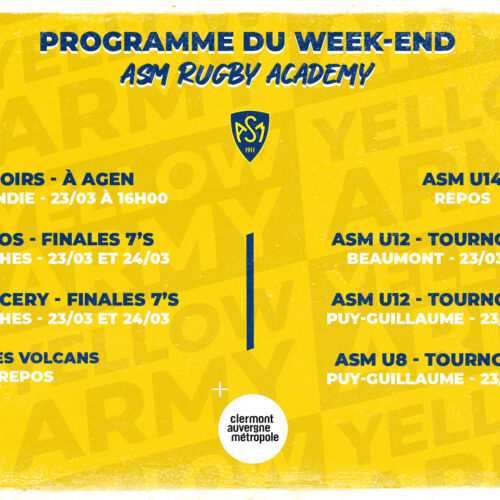 Déplacement à Agen pour le groupe Espoirs, finale des championnats de France 7’s U16 et U18, plateaux du comité pour l’école de rugby… Découvrez le programme du week-end de l’ASM Rugby Academy !