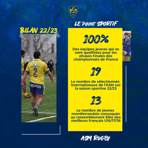 Dans le cadre de la clôture de sa saison 2022/2023, la section rugby de l’ASM vous propose tout au long des prochains jours un bilan en chiffres et en visuels des 10 derniers mois écoulés. Retour sur les performances sportives réussies de cette saison sportive.