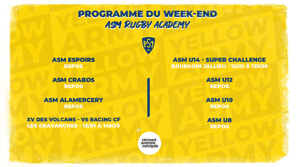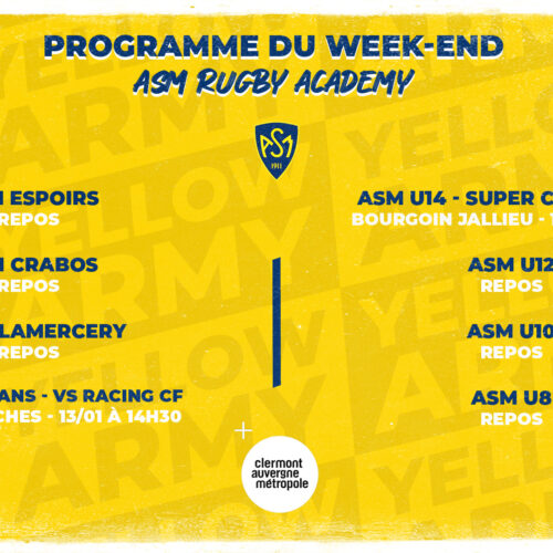 Si la grande partie de la section rugby ne reprendra le chemin de la compétition que la semaine prochaine, les groupes U15 et U14 seront sur le pont dès ce samedi 13 janvier ! Retrouvez le programme du week-end de la formation montferrandaise.