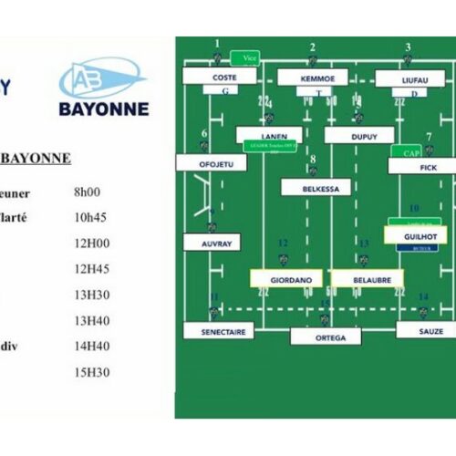 Ce samedi, les Espoirs jouent en amical à Massy tandis que nos juniors Crabos et nos cadets Alamercery se déplacent ensemble à Bayonne pour attaquer les play-off.