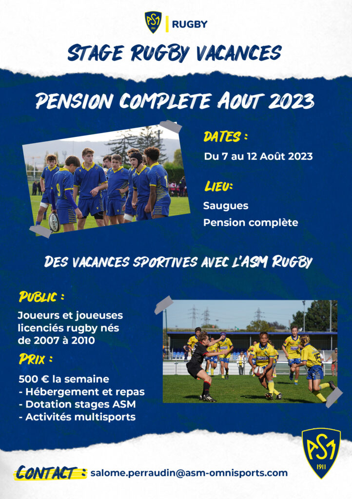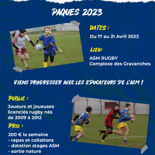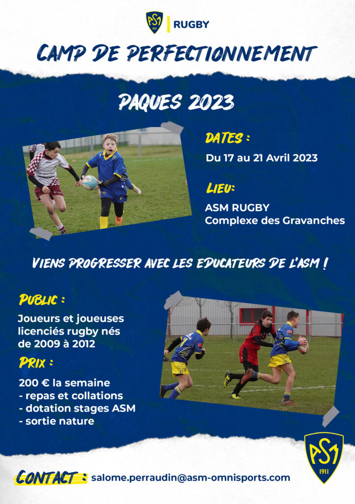 L’ASM Rugby lance les inscriptions pour tous ses stages, jusqu’à la fin de la saison ! Encadrés par les éducateurs formés et diplômés du club, ces stages de perfectionnement rugby s’adressent aux jeunes licenciés filles et garçons, et permettent de progresser au sein de l’environnement Jaune et Bleu !