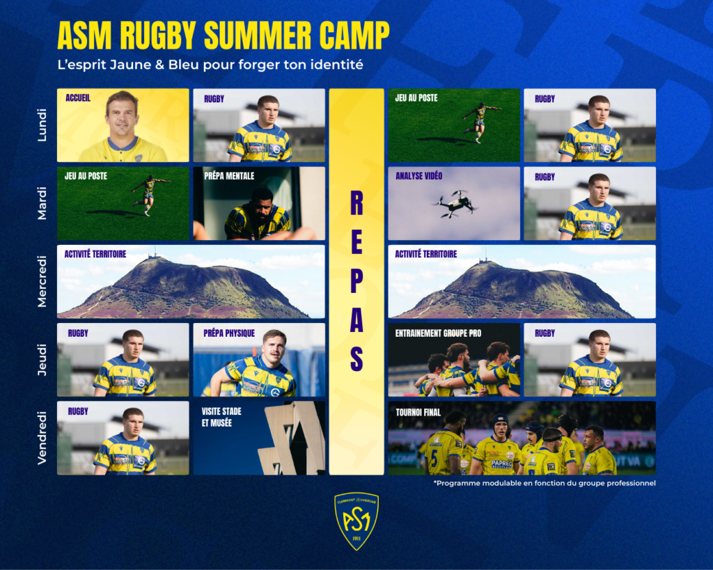Les stages « ASM Summer Camp » se lancent dès cet été 2026, pour plonger au cœur du quotidien d’un joueur professionnel de l’ASM Rugby. Entrainements rugby, séances spécifiques en fonction des postes, préparation physique et mentale… Une véritable semaine dans la peau d’un joueur professionnel du club Jaune & Bleu !