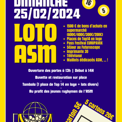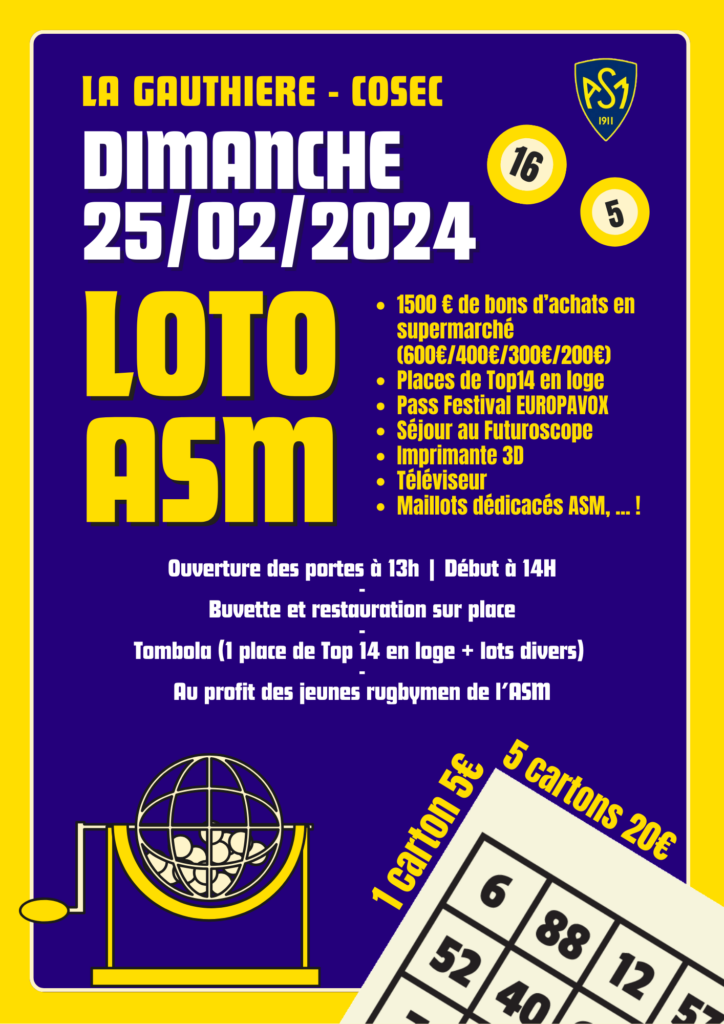 Le loto de l’ASM Rugby fait son grand retour ce dimanche 25 février 2024, après une pause de plusieurs saisons ! Un retour au COSEC de la Gauthière, au profit de la formation montferrandaise.