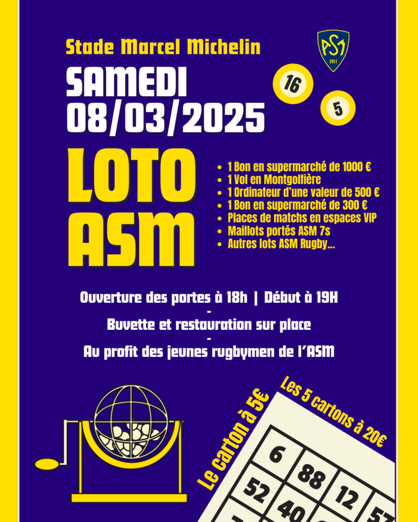 Pour la première fois, le loto de l’ASM Rugby prendra place au stade Marcel Michelin ce samedi 8 mars 2025, après son grand retour la saison dernière ! Une nouvelle édition organisée au profit de la formation montferrandaise.