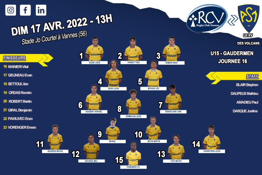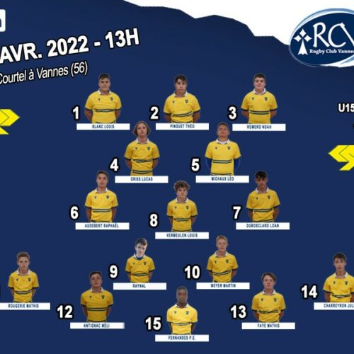 – U15 : Championnat à Vannes, Dimanche 17 Avril à 13H00.