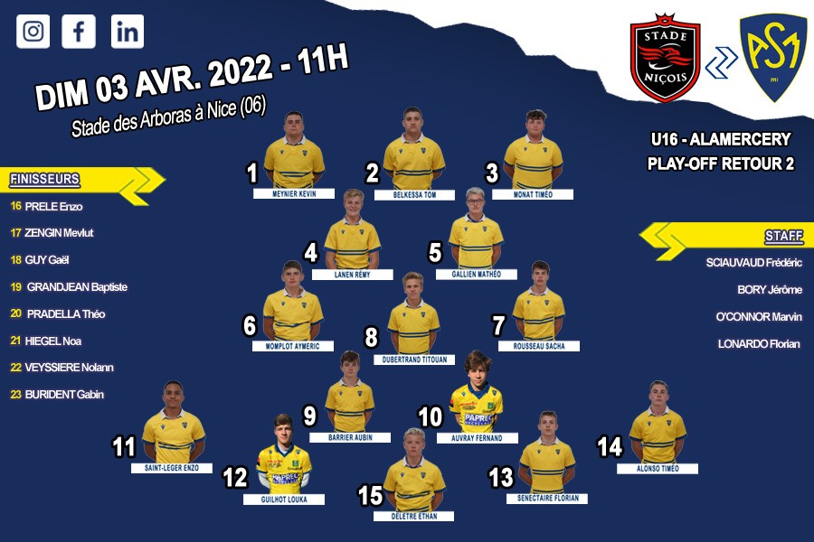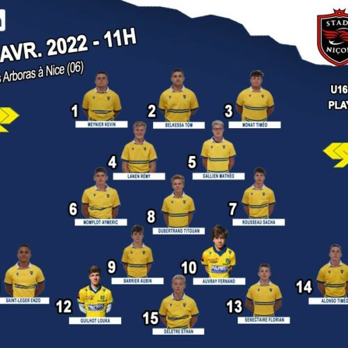 U16 se déplacent à Nice le Dimanche 3 Avril à 11H00.