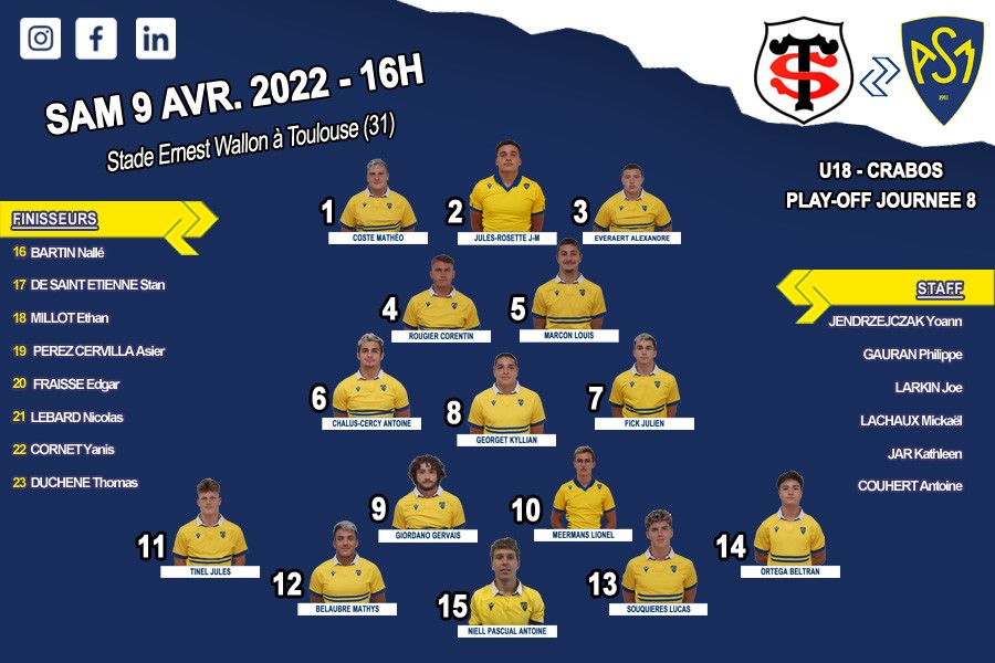 Les Crabos M18 se déplacent à Toulouse, Samedi à 16H00, au Stade Ernest Wallon.