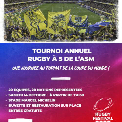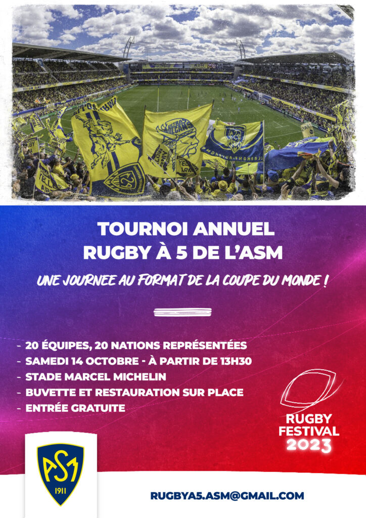 Le traditionnel tournoi mixte du rugby à 5 de l’ASM est de retour le 14 octobre, pour une édition attendue de tous ! Une édition qui prendra le format de la Coupe du Monde dans le cadre du Rugby Festival 2023, avec 20 équipes qui représenteront les 20 nations du tournoi.