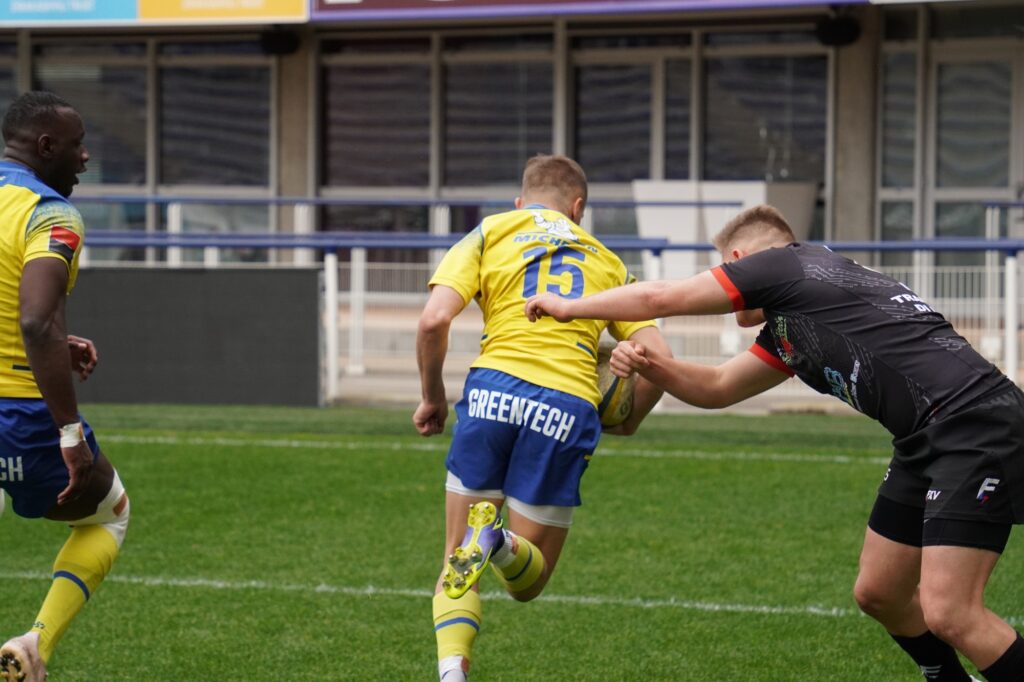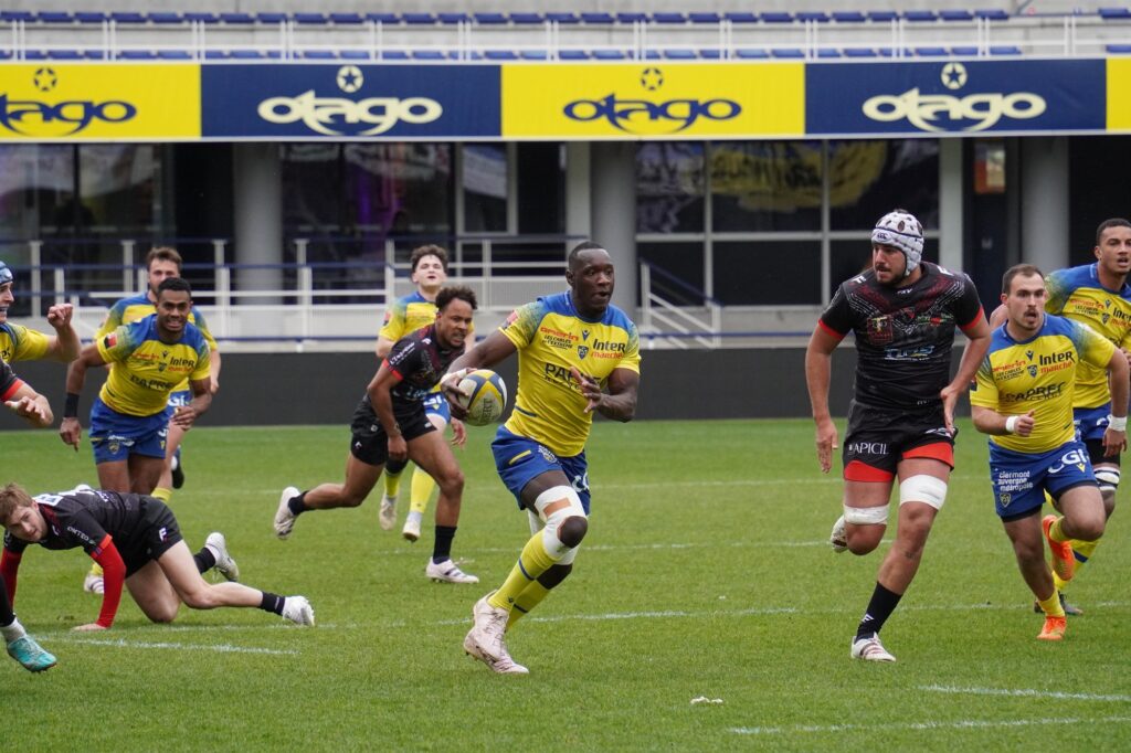 Un message visiblement bien passé auprès du groupe Jaune et Bleu, qui débuta le match pied au plancher, et surprit son adversaire du jour dès les premières minutes. Par un maul salvateur tout d’abord, qui termina sa course dans l’en-but des Oyomen. Puis sur un contre ensuite, après une touche récupérée dans les airs, puis un jeu au pied parfaitement dosé par le demi-de-mêlée Matéo Lajous, et conclut par le capitaine du jour Lucas Oudard.