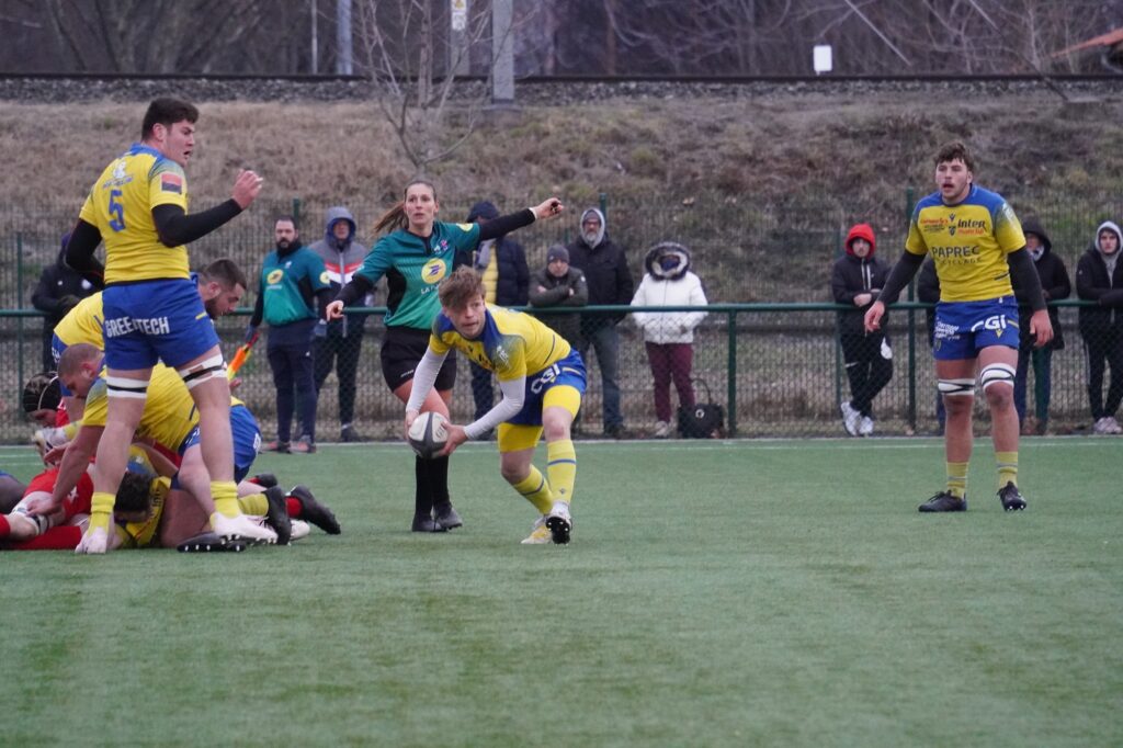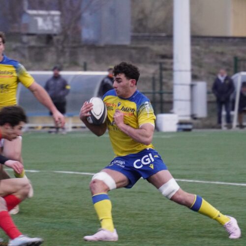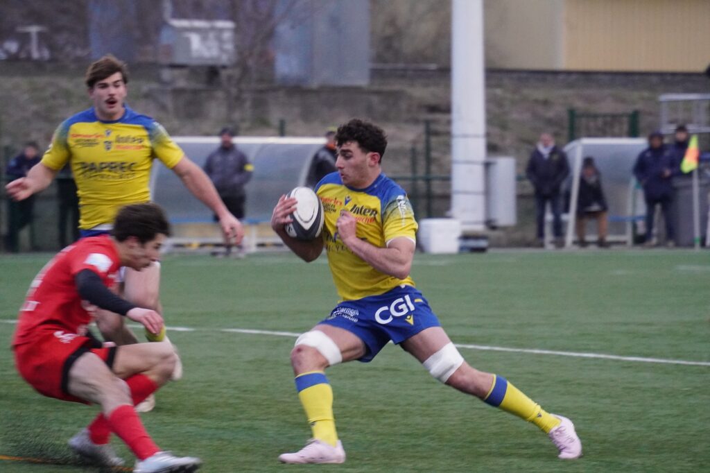 La deuxième mi-temps voit les deux équipes se partager des temps forts, tour à tour. Après un quart d’heure de jeu en seconde période, François Mey transperce la défense Aurillacoise sur une attaque en première main parfaitement maitrisée. Le jeune joueur italien accélère au centre du terrain, puis vient résister au retour de la défense adverse, avant d’aplatir dans le coin gauche de l’en-but aurillacois (17/13).