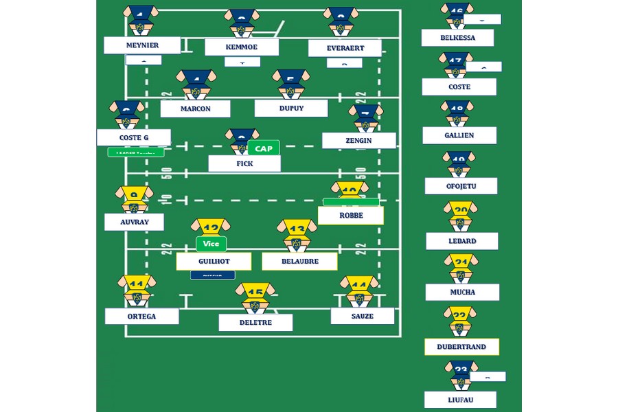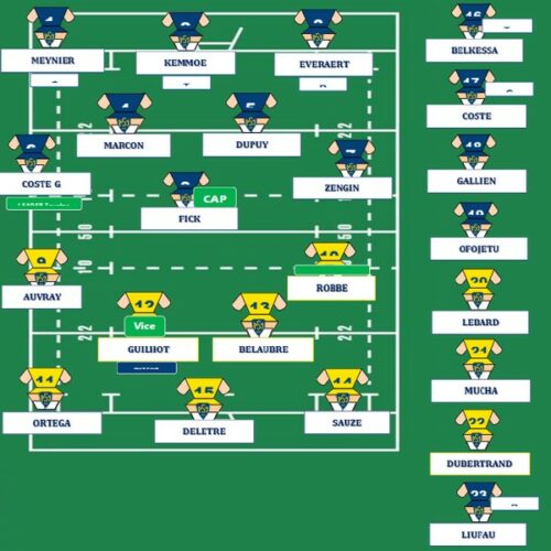 XV Ropero –  Zengin, Savinel, Baron, Ilhan – Delacre (o), Dubertrand (m) – Brousse-Kaiser, Fournier (cap), Gobet – Paul, Martinol – Arial, Chuan Un, Brunel –
