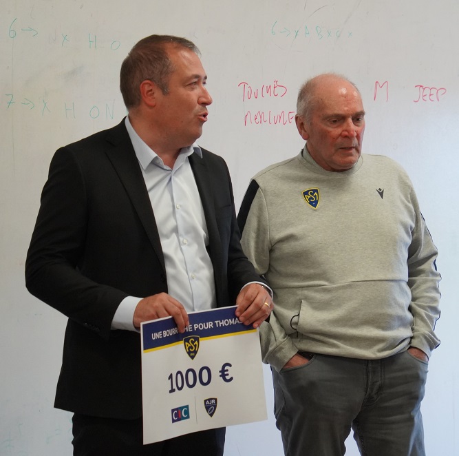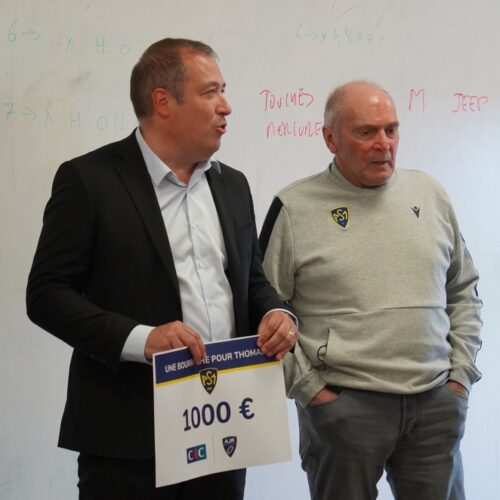En compagnie de l’AJR, c’est le papa d’un joueur de l’école de rugby de l’ASM qui a tenu à apporter son soutien complémentaire, par l’intermédiaire de sa structure. Mr Frederic Parel, Directeur Massif Central Entreprises au CIC, était accompagné d’un de ses collaborateurs, pour remettre un chèque de 1000€ supplémentaire à Thomas, au nom de son entreprise.