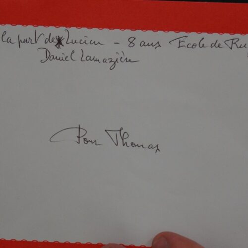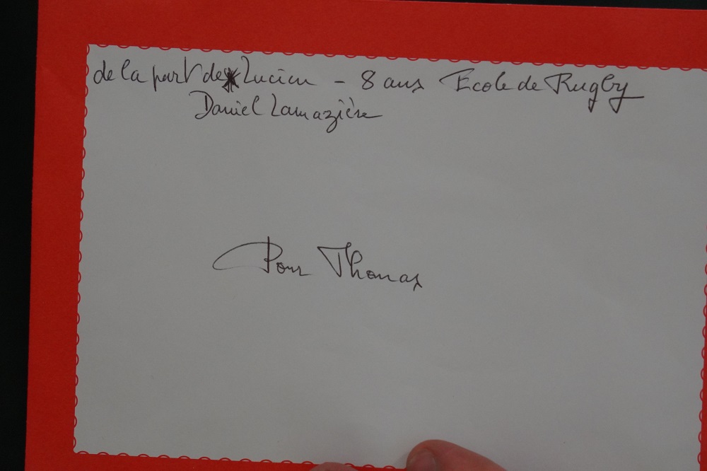 Une petite enveloppe rouge a également suscité l’attention de l’ensemble des personnes présentes dans la salle. Cette lettre portait le nom de Lucien Daniel Lamazière. Ce nom est aussi connu à l’école de rugby de l’ASM, puisque c’est un petit joueur de la catégorie U8, qui a apporté son soutien à Thomas. Une pièce de 2 € était glissée dans l’enveloppe de la part de Lucien, attention aussi symbolique qu’émouvante pour le joueur Espoirs.
