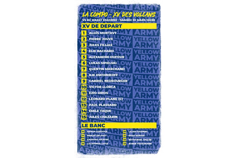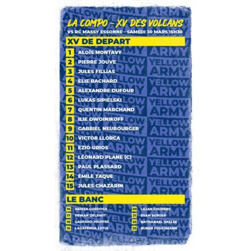 XV des Volcans – Massy samedi à 15h30 aux Gravanches
