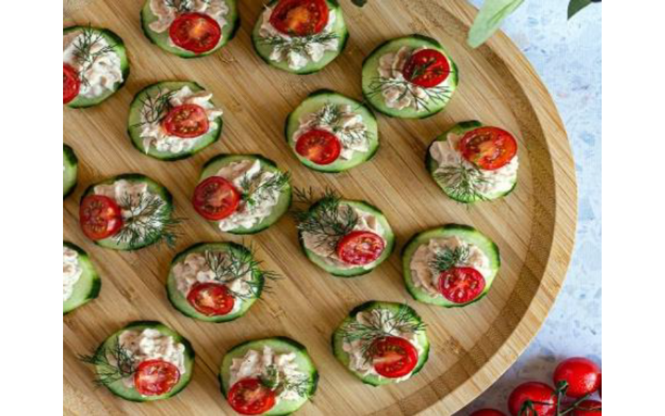 • Pocher la préparation au thon sur les rondelles de concombre puis ajouter une demi-tomate cerise et un brin d’aneth ou autre